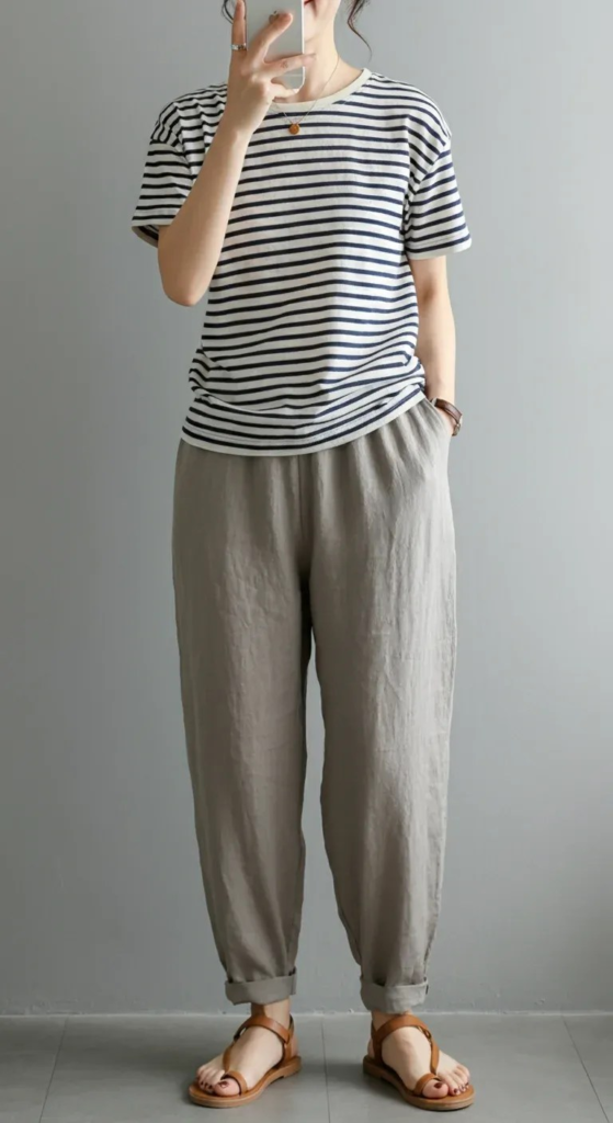 This is a classic summer look I keep returning to. Linen pants keep me cool, and striped tees add a simple style pattern. It’s comfortable for daily wear and still looks well put together.