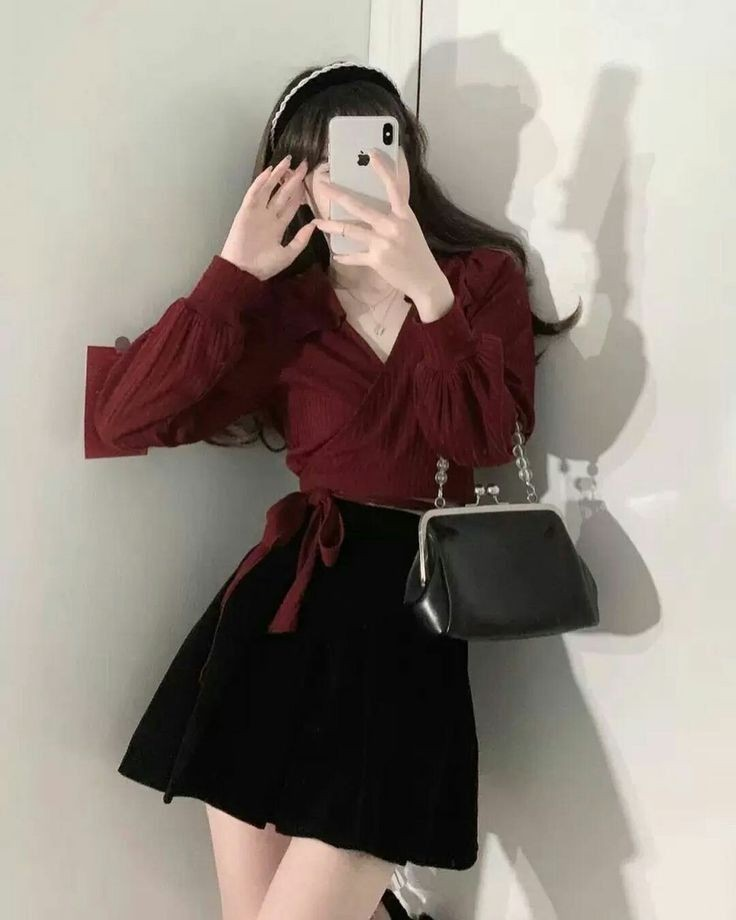 This outfit highlights the elegance of a black skirt paired with a deep burgundy wrap top. The rich color adds warmth while the wrap design creates a flattering shape. The look feels polished yet comfortable, making it suitable for work or casual outings.