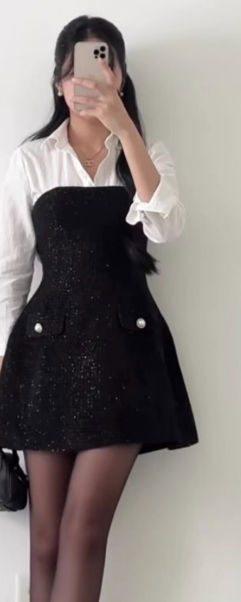 This combination blends classic and glam by pairing a white button-up with a sparkly black skirt. The contrast keeps the outfit balanced and versatile. It works well for winter evenings while still feeling structured and clean.