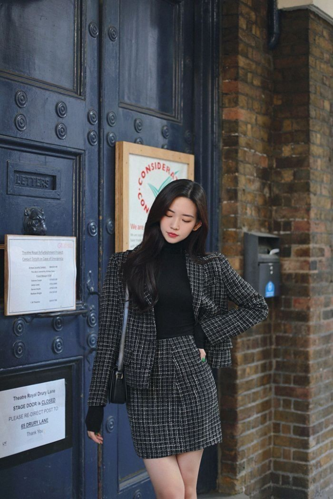 This pairing focuses on timeless winter styling with a tweed blazer and black skirt. Layered pieces keep it warm and refined. It’s a versatile option for both work and casual wear.