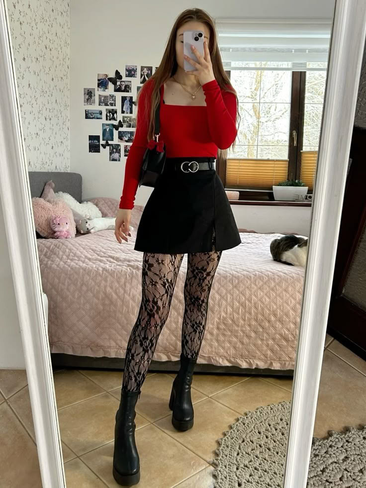 The bright red sweater adds impact to the black skirt base. The contrast creates a striking yet polished winter look. This outfit feels confident and stylish without being overdone.