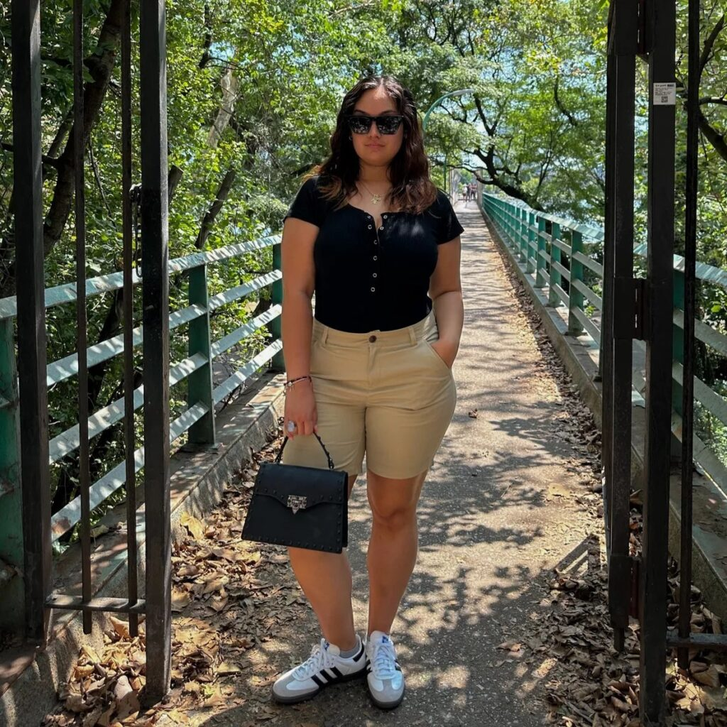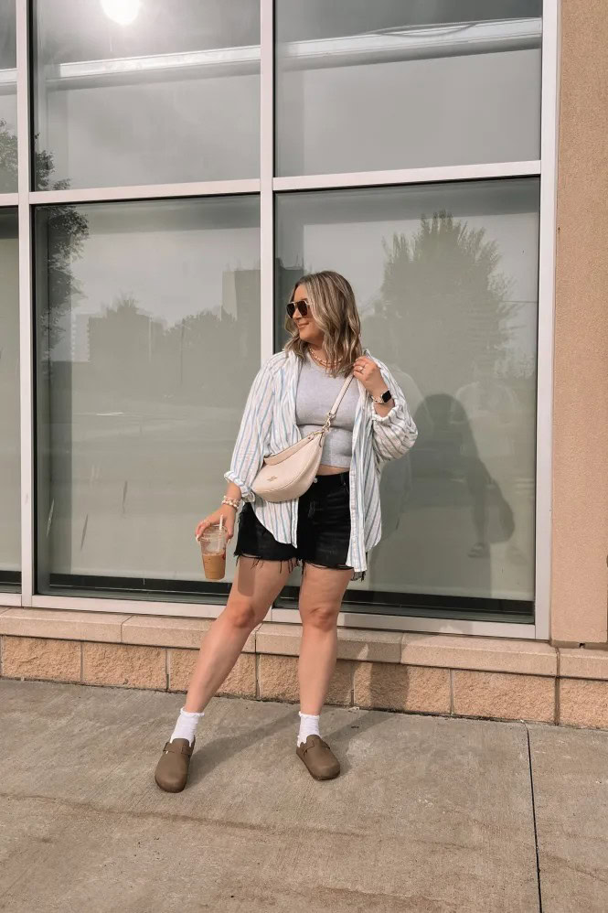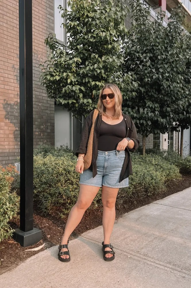 This is one of my go-to summer outfit ideas for midsize women because it’s simple but looks styled. Adding a cardigan changes the whole feel of basic shorts and a top. It’s perfect for casual days when I still want to look put-together.