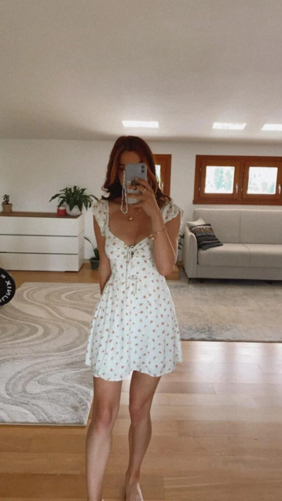 I find this dress style really flattering because the neckline and fitted top create shape without effort. The soft floral pattern keeps it light and fresh, while the sleeves add a bit of volume. It’s an easy choice for outdoor plans where I want to feel comfortable and still look styled.