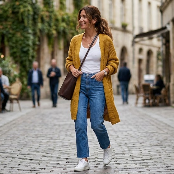 Long Cardigan with Tank Top and Straight Jeans