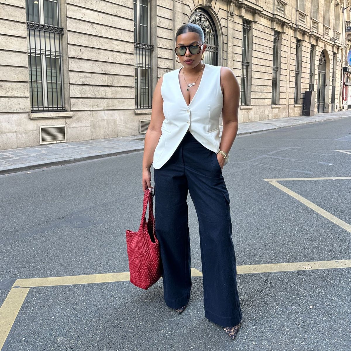 Insight: High-waist trousers create a longer leg line, which makes the whole outfit look cleaner.