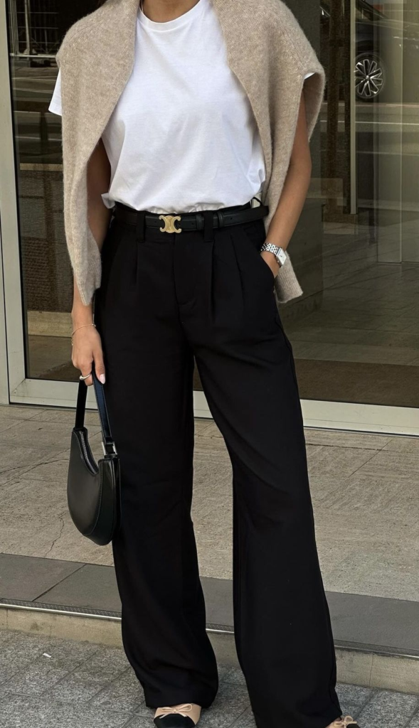 I like how this balances comfort and structure. Loose pants with a fitted top always work.