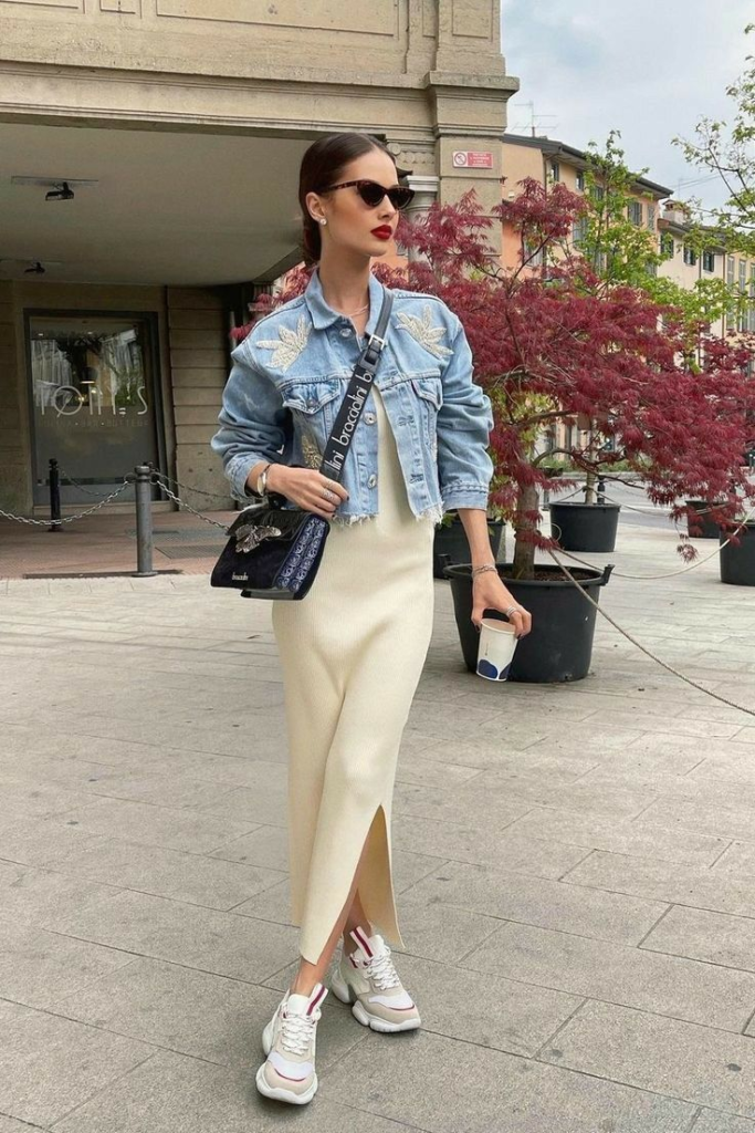 Midi Dress with Denim Jacket and Sneakers