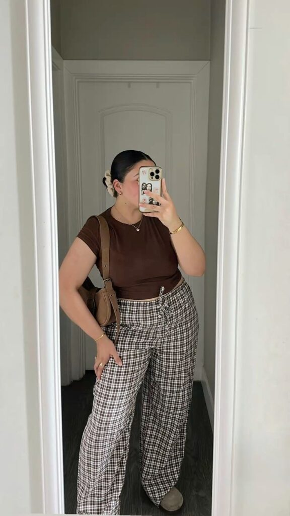 Wide-leg gingham trousers with a chocolate brown tee give me a preppy-relaxed vibe. A structured tan bag keeps it polished and versatile for everything from errands to casual outings.