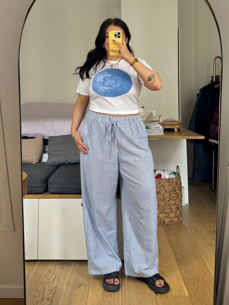 A celestial graphic tee with wide-leg striped trousers is effortless yet refined. I finish it with black slides and gold chains for casual lunch dates or summer errands.