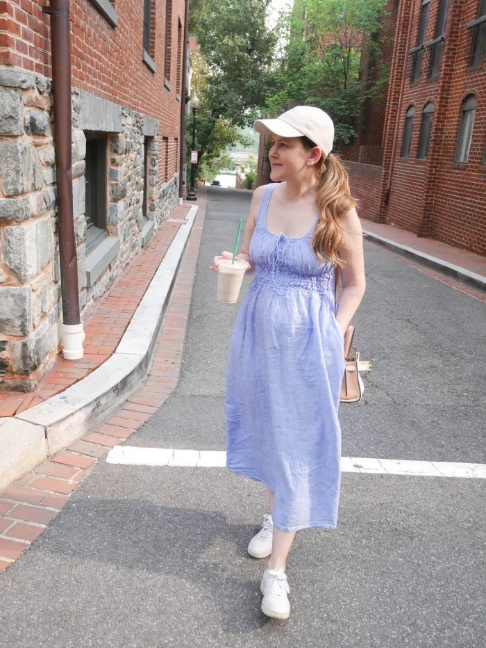 A periwinkle linen dress with a smocked waist feels special without overspending. I pair it with a baseball cap and white sneakers for a practical, stylish coffee-run look.