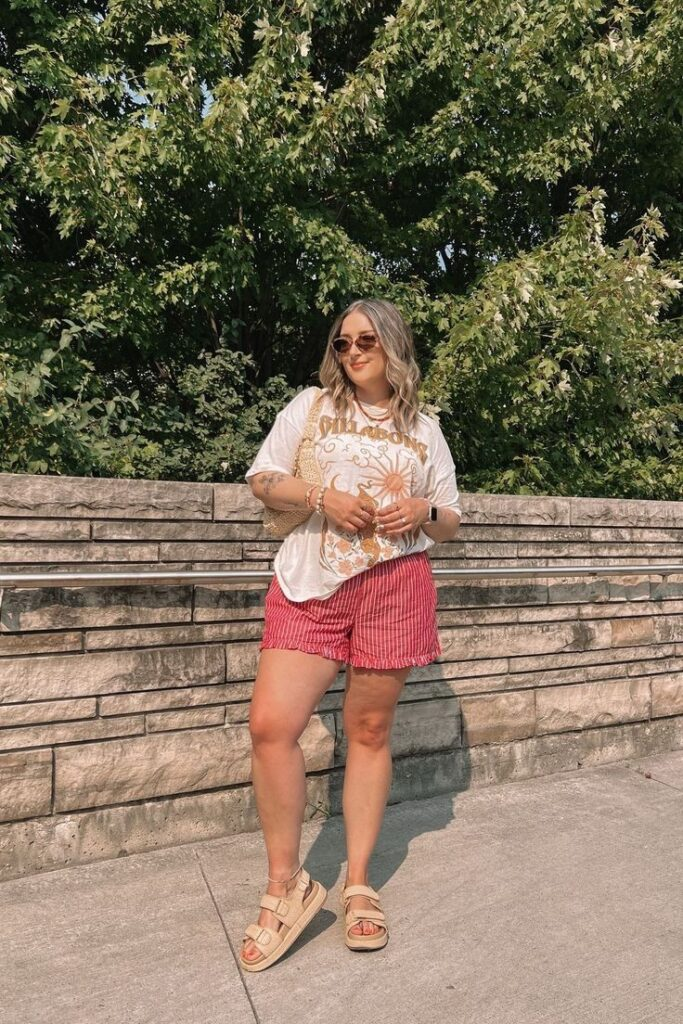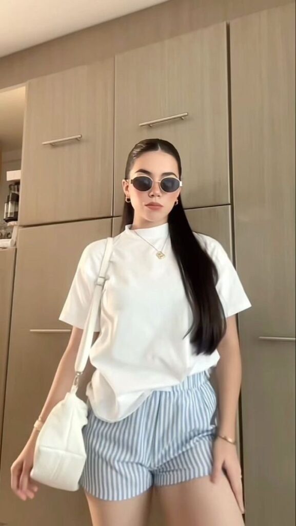 A crisp white tee tucked into striped shorts always feels put-together without trying. I complete the look with round sunglasses and a crossbody bag, letting clean proportions do all the heavy lifting.