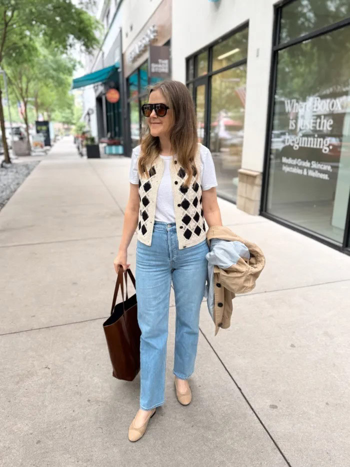 A cream-and-black argyle vest over a white tee and jeans makes me feel quietly confident. Ballet flats, a brown tote, and dark sunglasses complete a look that reads expensive but is totally attainable.
