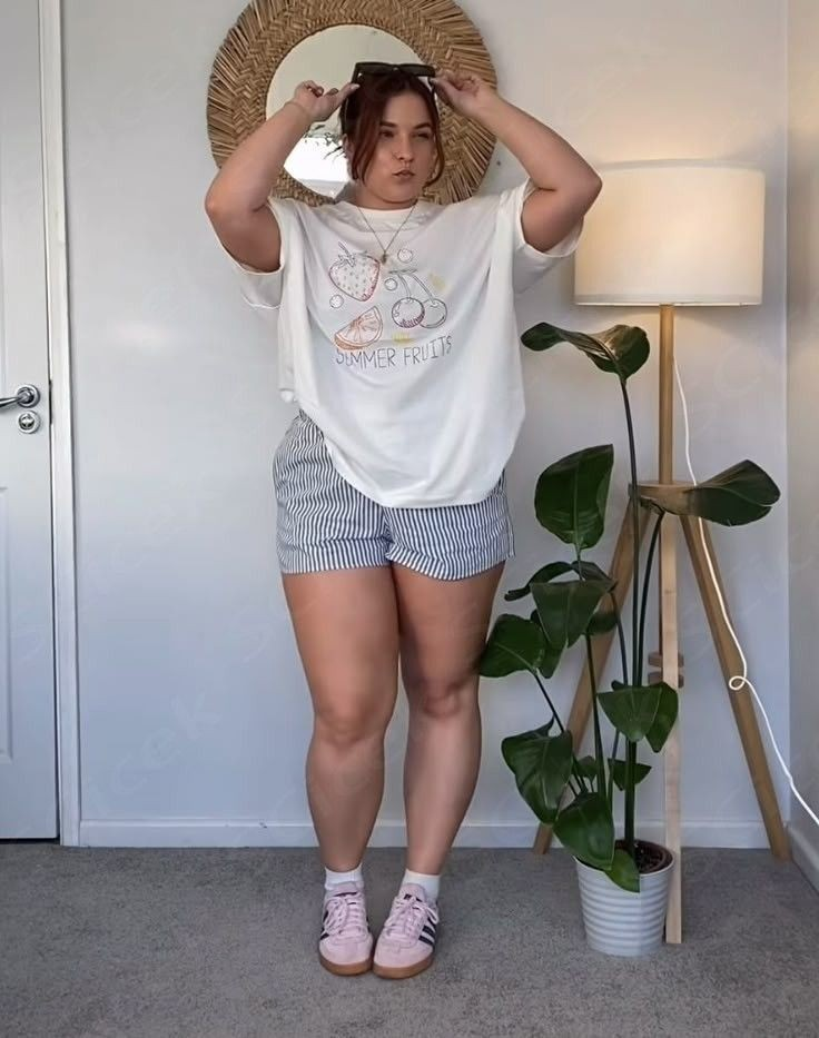 A fruit-printed vintage tee with crisp striped shorts is my lazy-day favorite. Pink platform sneakers and a straw hat instantly elevate this casual summer combination.