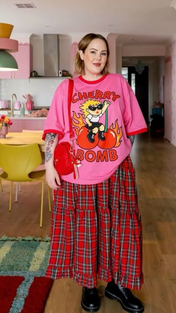 An oversized hot pink graphic tee paired with a red plaid midi skirt creates a playful, intentional look. I add chunky boots and a simple bag to tie together bold colors with polish.