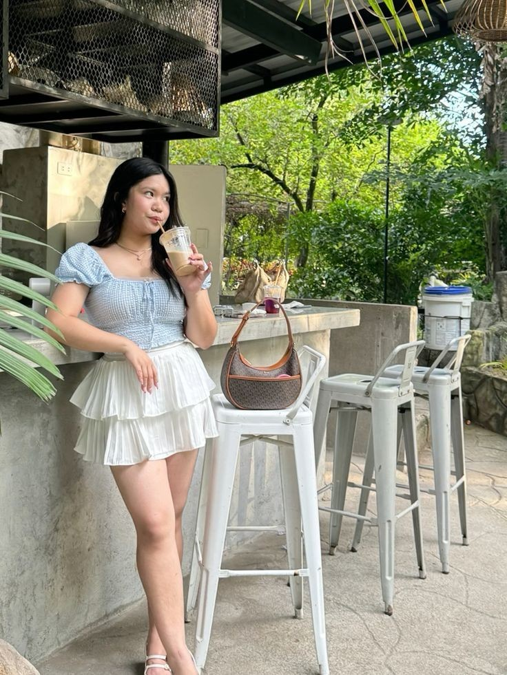 A soft blue gingham square-neck top with a ruffled white mini skirt is my patio-ready uniform. I balance feminine details with playful proportions for a relaxed summer-ready vibe.