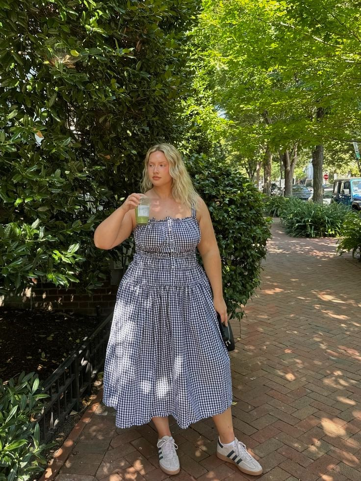 A navy-and-white gingham midi dress with a fitted bodice feels fresh and modern. I pair it with white sneakers and a structured bag for effortless charm at casual outings or weekend markets.