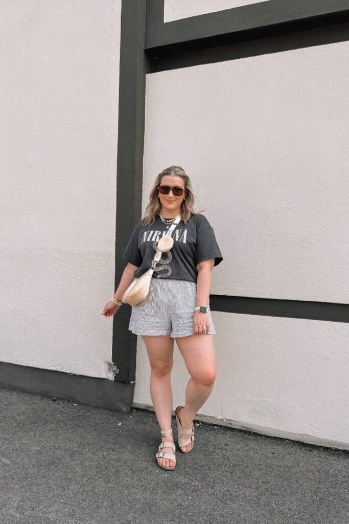 A Nirvana graphic tee with seersucker shorts is my go-to summer outfit for cool-girl vibes. I add a cream crossbody and white slides to keep it practical yet stylish for sunny days.