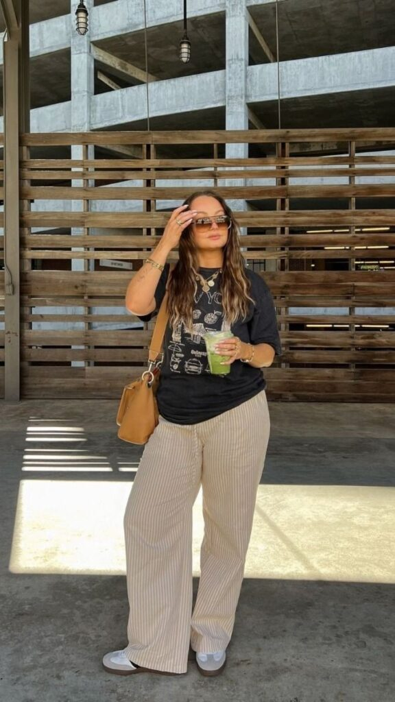 I pair a vintage-style graphic tee with cream pinstriped trousers for a balance of casual and polished. A camel shoulder bag and white sneakers keep it approachable while looking effortlessly chic.