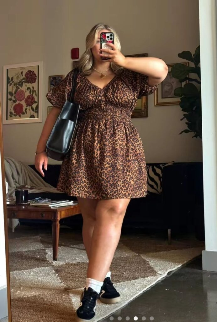 A brown leopard print dress with puffed sleeves feels effortless yet elevated for everyday errands. I combine it with chunky sneakers and a structured bag, letting the outfit read sophisticated without feeling overdone.