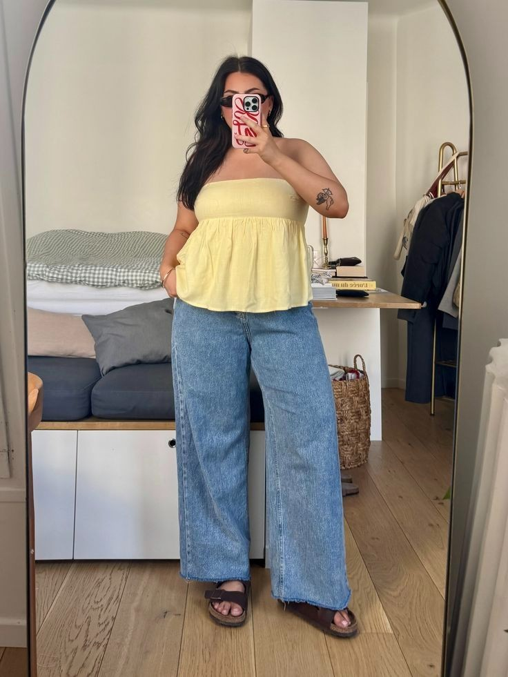 Pairing a butter-yellow strapless top with medium-wash jeans gives me that perfect casual-chic summer energy. I like adding black slides or a linen shirt for evening outings, keeping it practical yet stylish.