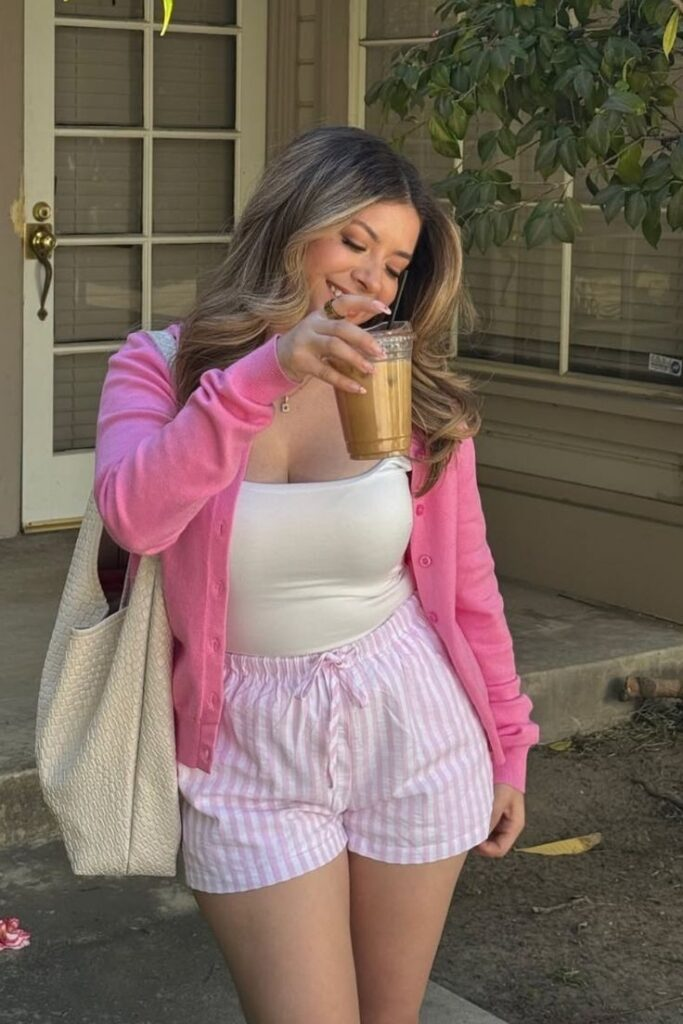 I love throwing on a hot pink cardigan over a white crop top and pastel shorts—it instantly elevates a simple outfit. With relaxed shorts, a cream tote, and a delicate gold necklace, this look feels put-together without overthinking it.