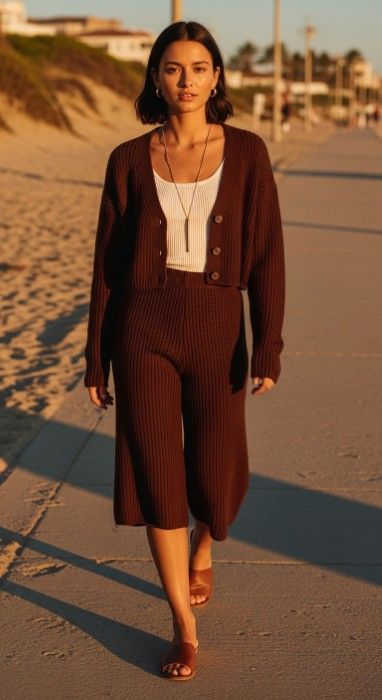 3. Chocolate Brown Knit Co-ord Set — Cropped Cardigan and Wide-Leg Shorts