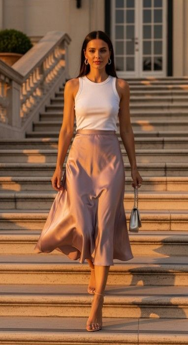 10. Satin Midi Skirt and White Tank