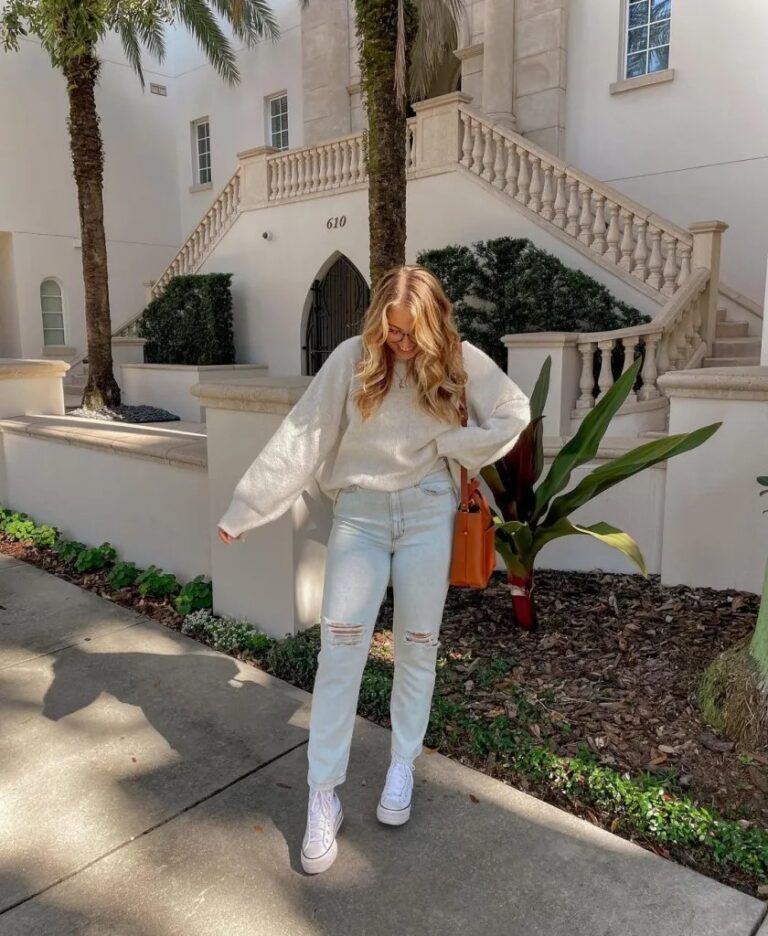 A cream sweatshirt combined with light-wash denim creates a relaxed take on summer church outfits. The comfortable pieces still feel intentional when styled with clean white sneakers. A warm-toned crossbody bag adds depth and balance to the neutral palette. The outfit feels effortless while still showing respect for a Sunday gathering.