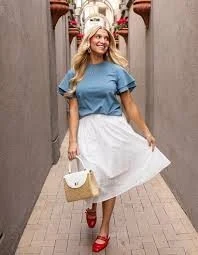 A ruffled chambray top paired with a crisp white midi skirt creates a simple yet stylish option for summer church outfits. The chambray fabric keeps the outfit relaxed while the skirt adds elegance. Red ballet flats bring a small pop of color that feels cheerful and intentional. A woven handbag completes the look with texture and charm.