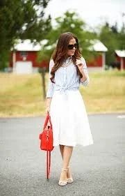 A white midi skirt styled with a striped button-up shirt creates a bright and classic combination for summer church outfits. The mix of clean white and subtle stripes feels fresh and polished. A red handbag adds a bold yet balanced accent to the outfit. Minimal jewelry and neutral accessories keep the overall look neat.