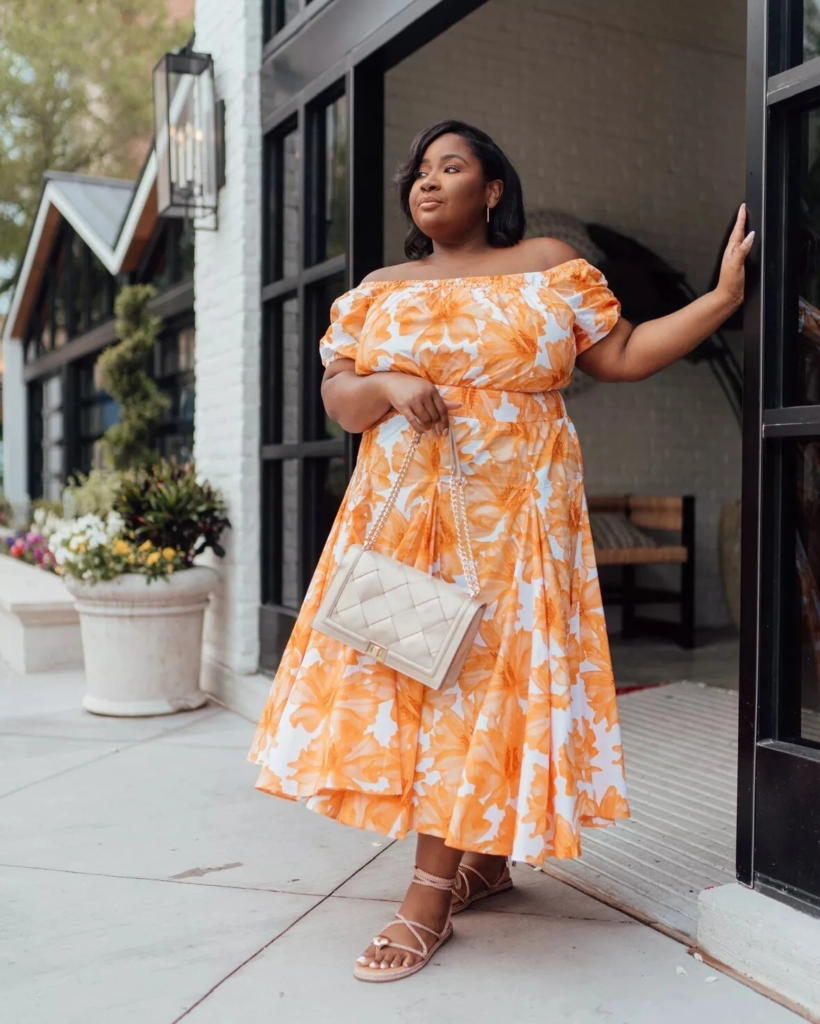 An off-shoulder floral dress with orange tones brings color and charm to summer church outfits. The puff sleeves add a playful touch while the midi length keeps the outfit modest. The bright print feels lively but still appropriate for church service. Gold jewelry and strappy sandals add a light and elegant finish.