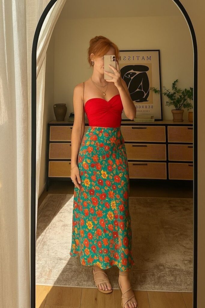 A red sweetheart-neckline top paired with a green floral midi skirt creates a lively combination for summer church outfits. The colors feel bright and cheerful while still appearing balanced and tasteful. Thin straps add a feminine detail that keeps the outfit light for warm weather. Neutral sandals help ground the look and maintain a refined feel.