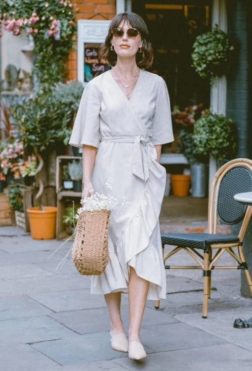 A linen wrap dress is a dependable choice for summer church outfits because it blends structure with comfort. The belted waist creates a flattering shape while the midi length keeps the outfit modest and suitable for a Sunday setting. Light neutral tones such as cream help the outfit feel calm and elegant. Simple sandals and a woven bag finish the look while keeping everything comfortable for warm weather.