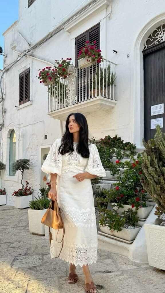 A cream lace midi dress with delicate eyelet details creates a graceful option for summer church outfits. The breathable fabric keeps it comfortable while still looking elegant. Puff sleeves add gentle volume that makes the dress feel special without becoming dramatic. Slide sandals and a structured bag complete the outfit in a relaxed yet polished way.