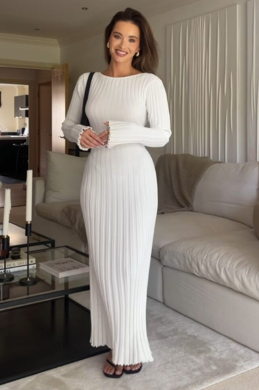 A white ribbed knit dress creates a clean and sophisticated base for summer church outfits. The fitted silhouette keeps the look modern while longer sleeves add modest coverage. Pairing it with a structured black shoulder bag and simple slides keeps the outfit sleek and balanced. Minimal jewelry allows the overall look to remain refined and effortless.