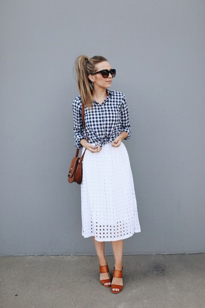 A navy gingham button-up styled with a white eyelet midi skirt creates a classic choice for summer church outfits. The structured shirt brings a neat and confident feel while the skirt softens the look with texture. Terracotta block-heel sandals add warmth and comfort. A small crossbody bag completes the outfit with a practical and polished touch.