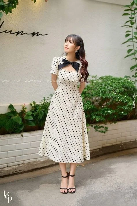 A cream midi dress with small black polka dots offers timeless style for summer church outfits. The bow detail at the neckline adds personality while keeping the look elegant and modest. The A-line silhouette and ankle-length design create a graceful appearance. Simple black sandals and minimal jewelry help the outfit stay polished and balanced.