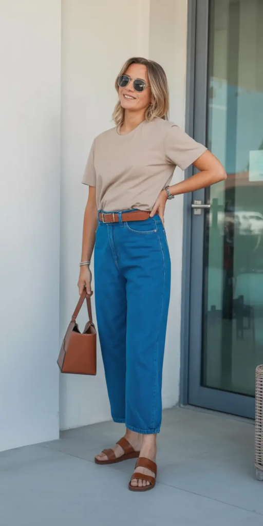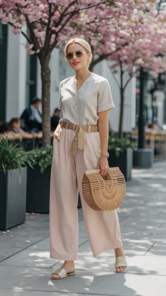 This outfit shows how soft neutral colors can still feel stylish and confident. A light linen blouse paired with loose blush trousers creates a look that feels relaxed but still neat and polished. The belt helps define the waist so the outfit keeps its shape while remaining comfortable.