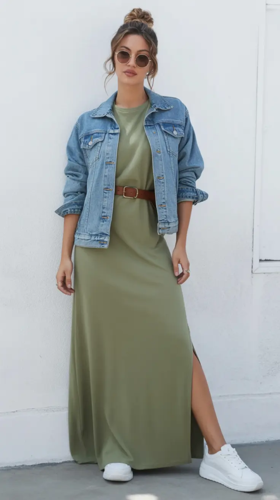 A soft green midi dress paired with a denim jacket creates an outfit that feels both relaxed and styled. The color feels calm and natural, while the jacket adds structure.