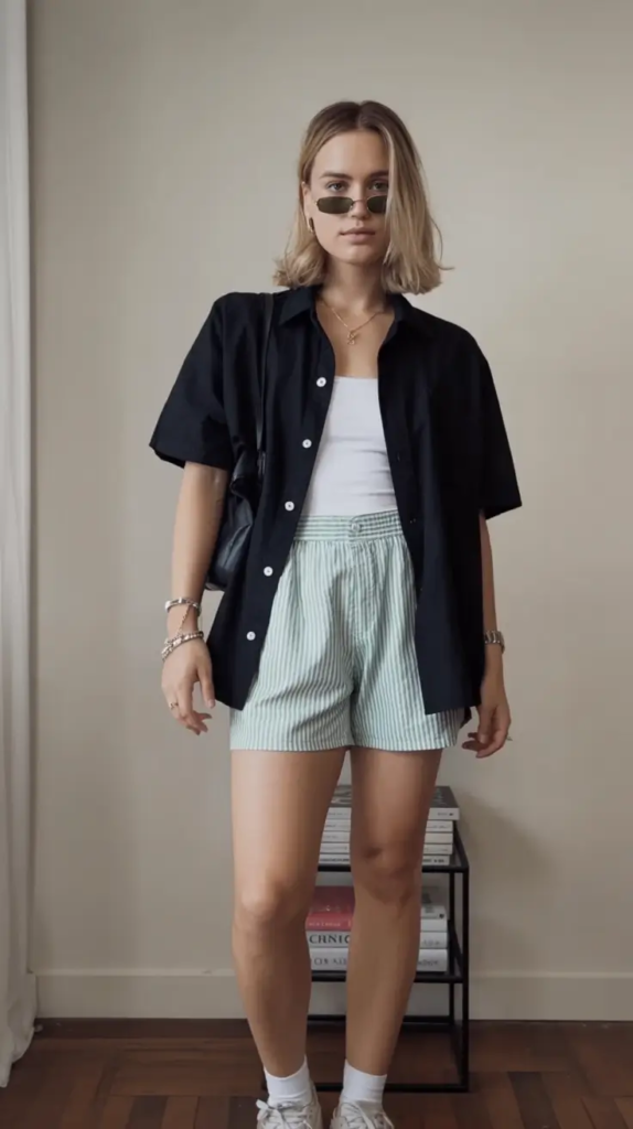 Striped shorts with a tank and open shirt create a playful casual outfit. The combination feels light and practical for warmer days.