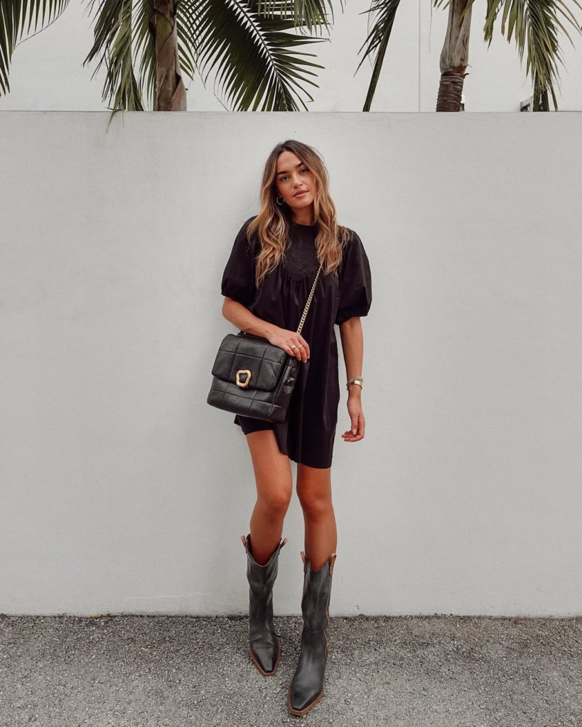 I often reach for a black mini dress with tall brown cowboy boots for a sleek, everyday look. It’s simple yet confident, perfect for brunch or a city walk. Minimal gold jewelry and a quilted bag add subtle polish.