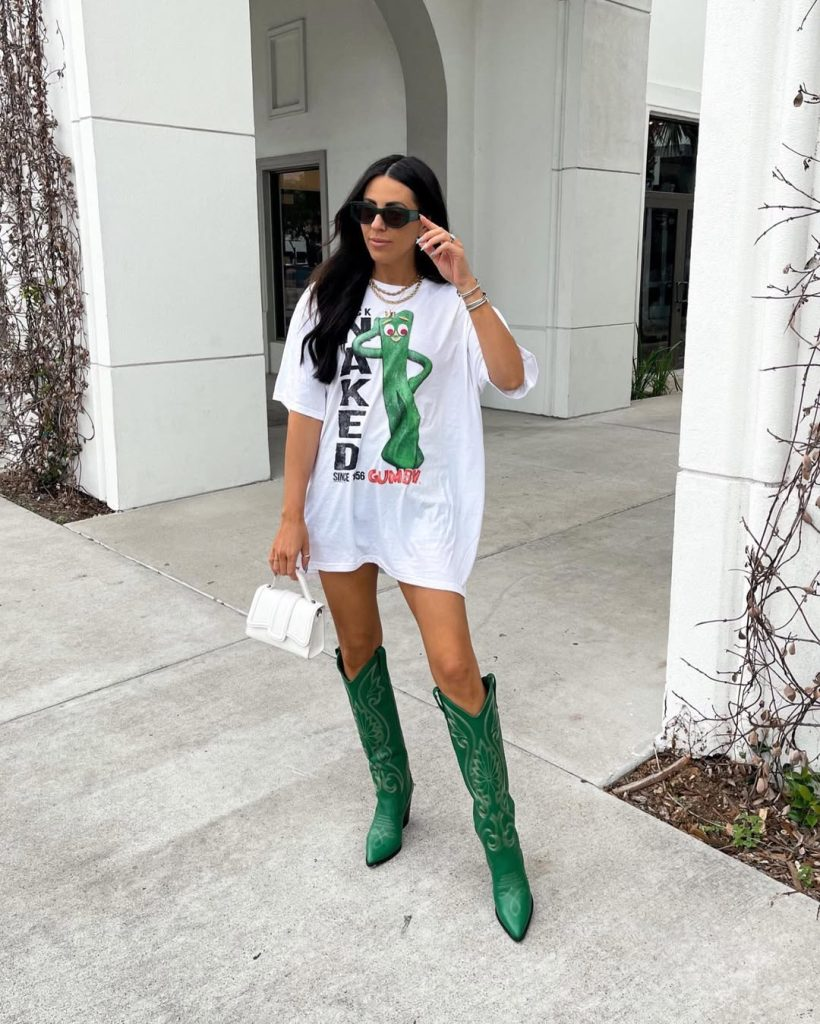 I love pairing an oversized graphic tee as a mini dress with bright green cowboy boots. The vibrant boots instantly draw attention while keeping the look playful and casual.