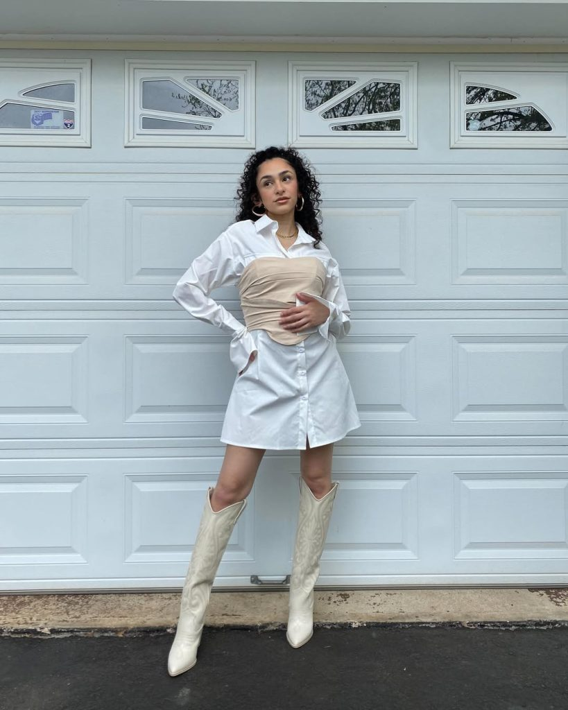 A crisp white shirt dress with a beige corset top and knee-high boots gives me polished yet western-inspired elegance.