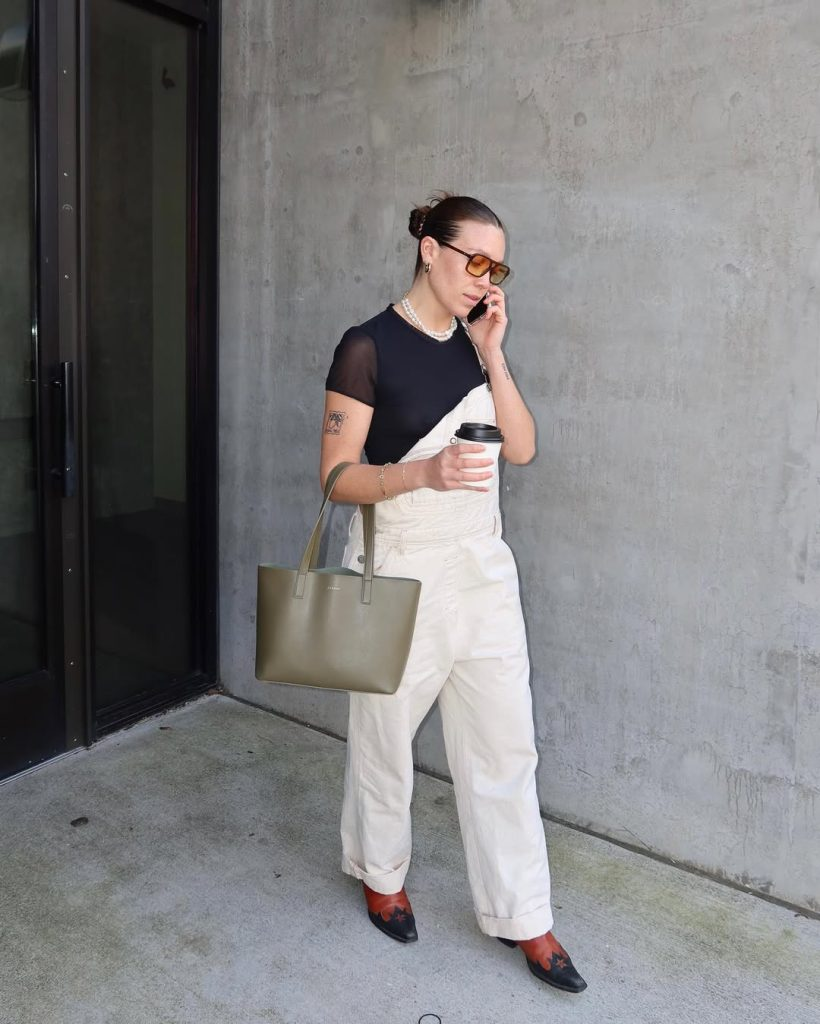 Neutral beige overalls paired with a mesh top and red ankle boots create a 2026 urban utility look. The bold red boots add personality without overpowering the outfit.