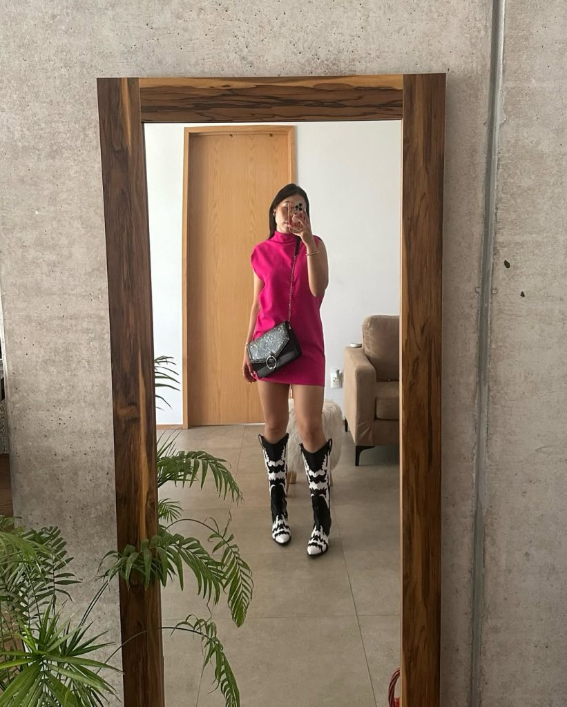 A bright pink mini dress with patterned black-and-white boots delivers a playful, modern aesthetic.