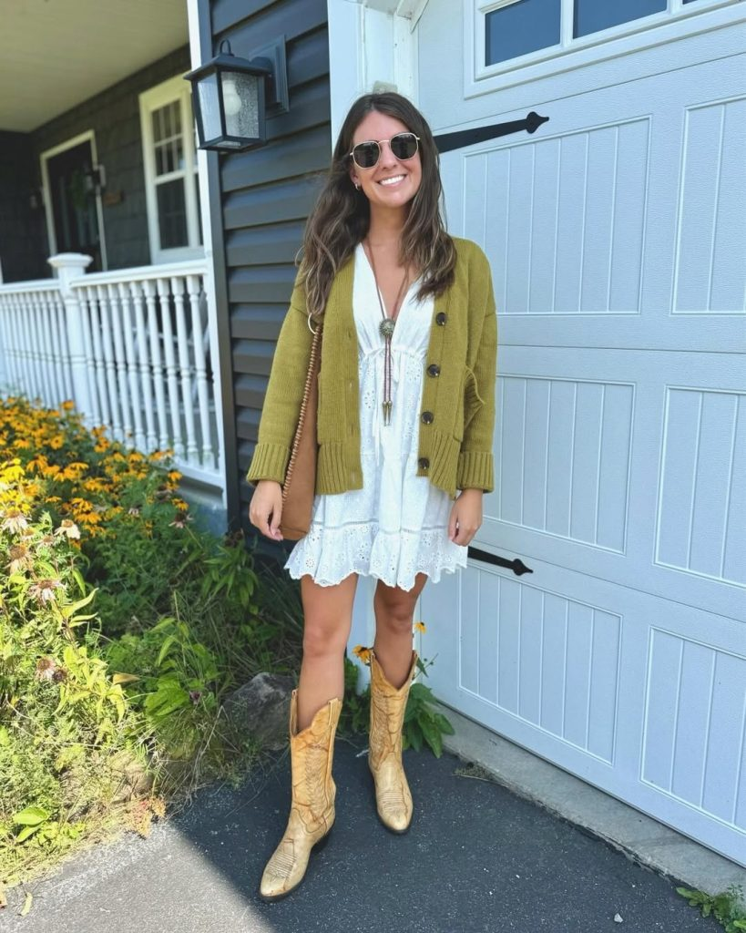 A white lace short dress, olive cardigan, and tan boots give me cozy early fall vibes. Perfect for countryside walks or casual brunches.