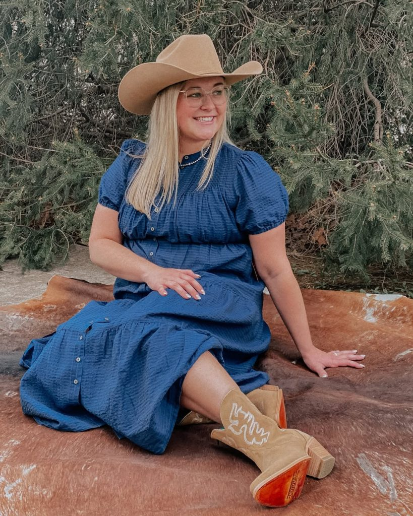A blue prairie midi dress with beige boots proves western style works at any age. Minimal accessories keep the outfit elegant yet approachable.
