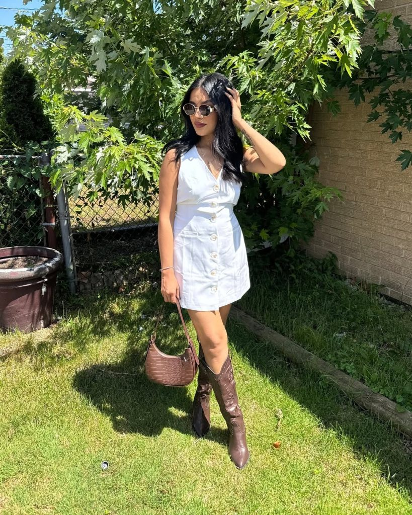 White short dresses paired with brown boots create a fresh summer look. Lightweight layers like denim jackets work well for cooler evenings.