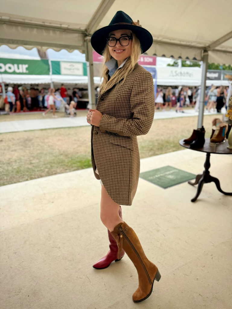 A tailored houndstooth blazer dress with red and brown boots makes fall outfits polished yet western-inspired.