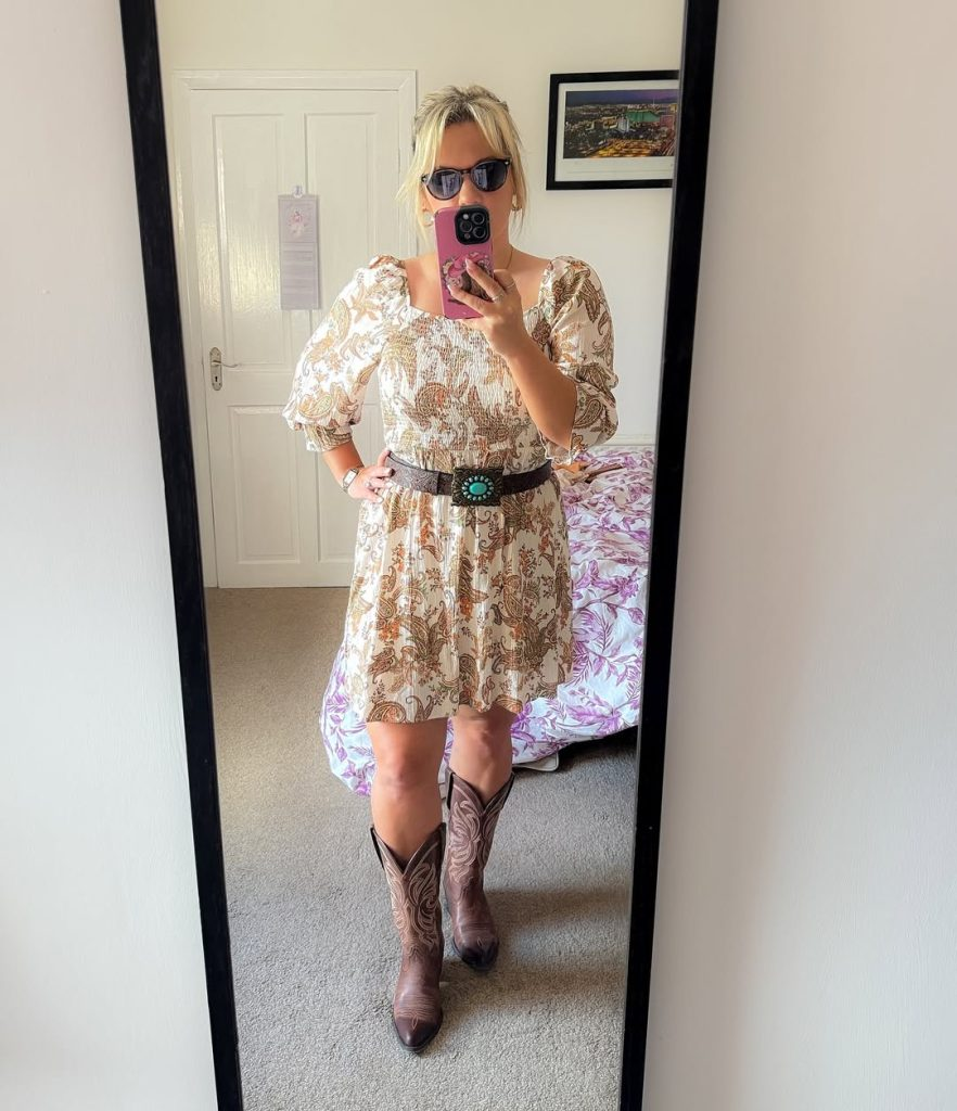 A floral western print mini dress with brown boots delivers a casual and stylish daytime outfit.